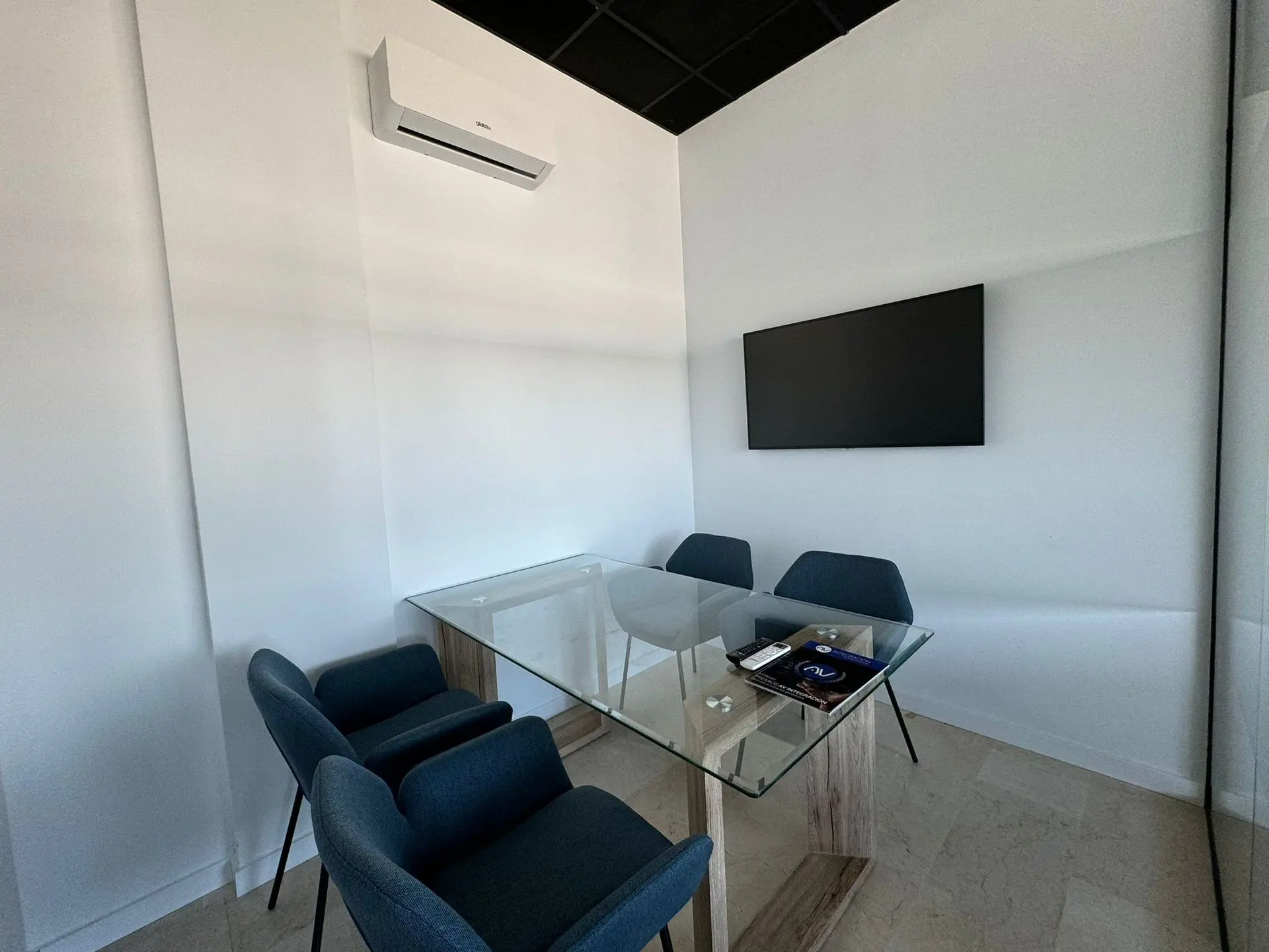 Sala de reuniones equipada para videoconferencias y presentaciones.