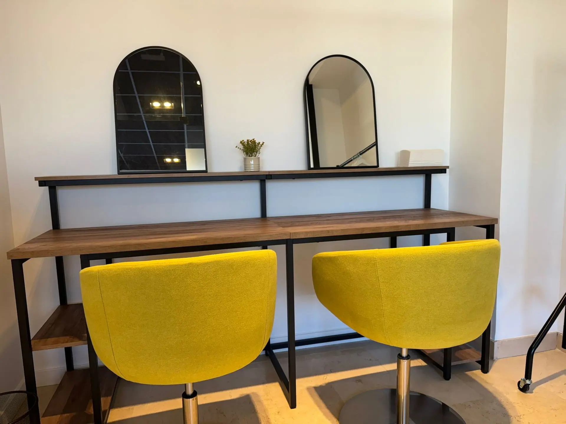 Sala de maquillaje cómoda y funcional para preparativos en producción.